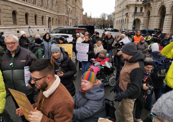 Deswegen rief der Österreichische Behindertenrat zu einer Pressekonferenz am 29.11. sowie zu einer Demo am 6.12. vor dem Rathaus auf. Rund 150 Teilnehmer*innen gingen mit Trillerpfeifen, Plakaten und Redebeiträgen auf die Straße, darunter auch eine Gruppe der Lebenshilfe Wien bzw. Österreich.